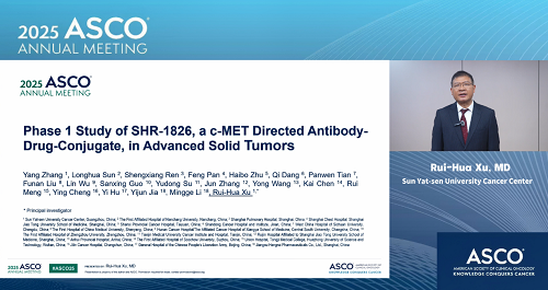 2025年美国临床肿瘤学会(ASCO)年会于5月30日至6月3日在美国芝加哥举行。本次大会,由中山大学肿瘤防治中心徐瑞华教授牵头、AG百家乐自主研发的靶向细胞间质上皮转换因子(c-MET)ADC药物SHR-1826的一项I期临床研究入选临床科学研讨会,并由徐瑞华教授口头报告了该研究结果。该研究由43家国内中心共同完成。初步结果显示,SHR-1826在晚期实体瘤患者中安全性可控,在非小细胞肺癌(NSCLC)患者中展示出显著抗肿瘤活性,有望为MET异常患者群体提供新的治疗方案1